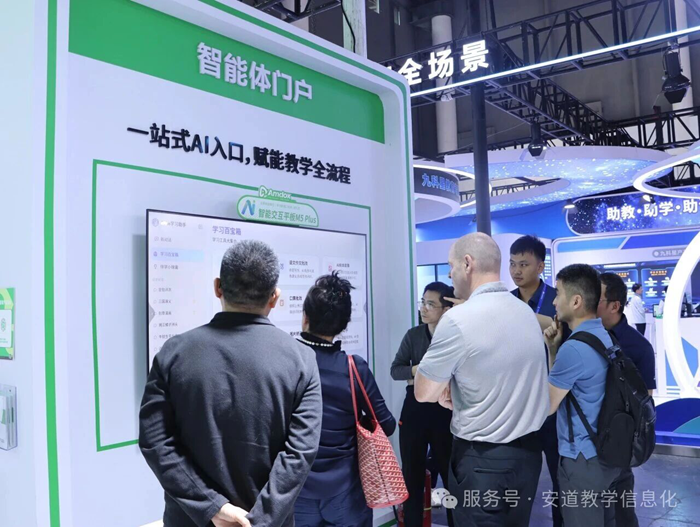 安道教育以“AI驅動智慧教學,開啟全場景新體驗”為核心主題亮相展會,設置七大特色展區,全景呈現AI與教育教學深度融合的創新實踐。