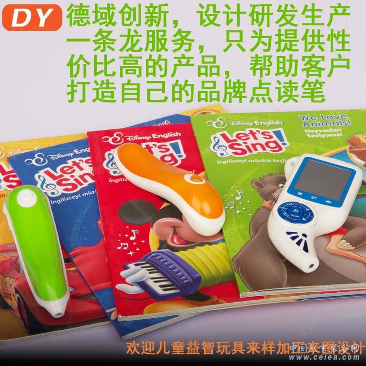 產品詳細介紹點讀筆定制方案,專業點讀筆廠家提供 德域公司于2011年成功推出了點讀筆系列方案,屬于國內最早一批專注投入研發點讀筆方案的公司,為客戶提供點讀筆專業研發、有聲圖書編錄、外殼開模注塑、OEM\ODM、方案選擇。 目前市面上有用到松翰、凌陽、KB、格萊、美哲、安凱、瑞芯微等方案,松翰方案是應用最多最穩定的方案之一。我們可以根據客戶具體需求訂制,有效控制成本提供好的價格與技術支持, 目前是行業公認最專業、最有竟爭力的廠家之一。 2015年德域與臺灣點讀方案公司松翰達成戰略合作關系共同研發新一代點讀芯片組,開放研究實驗室與點讀方案共同協作研發,同時擴大生產規模,創建目前國內最大的點讀筆OEM生產基地(7000平方米)。 首先看看點讀筆能用在哪些地方。 點讀筆常見應用如下: 1)幼兒早教類:幼兒圖書、幼兒地墊、幼兒掛圖、故事機、有聲成長日記、有聲相冊、DIY錄音 2)學生學習類:教材、有聲詞典、有聲詞典卡、單詞卡片、有聲課堂記錄本 3)成人類:多國學習教材、旅游手冊、有聲記錄本,語音點讀地球儀,古蘭經,佛學點讀,中醫穴位點讀等 4)特殊應用:身份識別系統、防偽、有聲地圖、盲人學習、視頻教學、人機互動學習、聲控儀