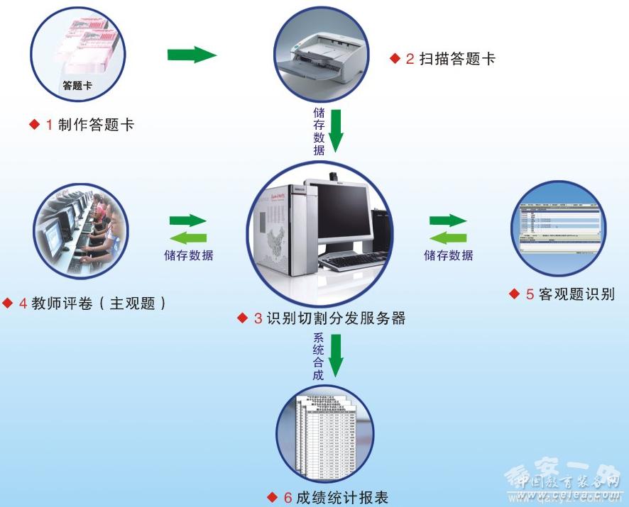 產品詳細介紹網上閱卷又稱網絡閱卷、計算機閱卷或無紙化閱卷。它是基于計算機網絡環境,運用圖片掃描、模式識別、圖像處理等技術對考試答題卡進行電子化處理的過程。此閱卷方式將客觀題與主觀題都在一張答題卡上作答,通過高速文檔掃描儀掃描存儲到計算機內,得到清晰準確的圖像文件后,客觀題由計算機自動閱卷,主觀題無需再翻卷批閱,而是由老師通過計算機進行閱卷,閱卷完畢后由計算機自動匯總分數,并可隨機生成幾十種成績分析統計報表。網上閱卷方式公平公正、方便快捷,大大提高工作效率,降低教師的工作強度,對減少和有效控制評卷誤差、監控評卷質量起到了積極作用,使考試管理工作實現了真正意義上的全面信息化、自動化、網絡化。