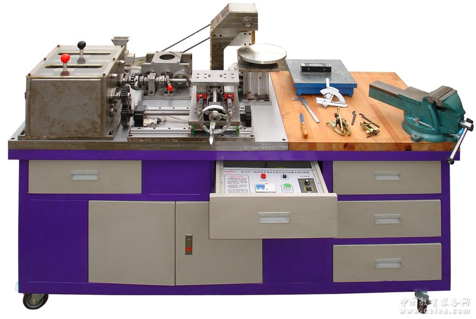 本裝置主要由實訓臺、動力源、機械裝調對象(機械傳動機構、多級變速箱、二維工作臺、間歇回轉工作臺、牙嵌式離合器機構、沖床機構、送料機構等)、鉗工常用工具、量具等部分組成。