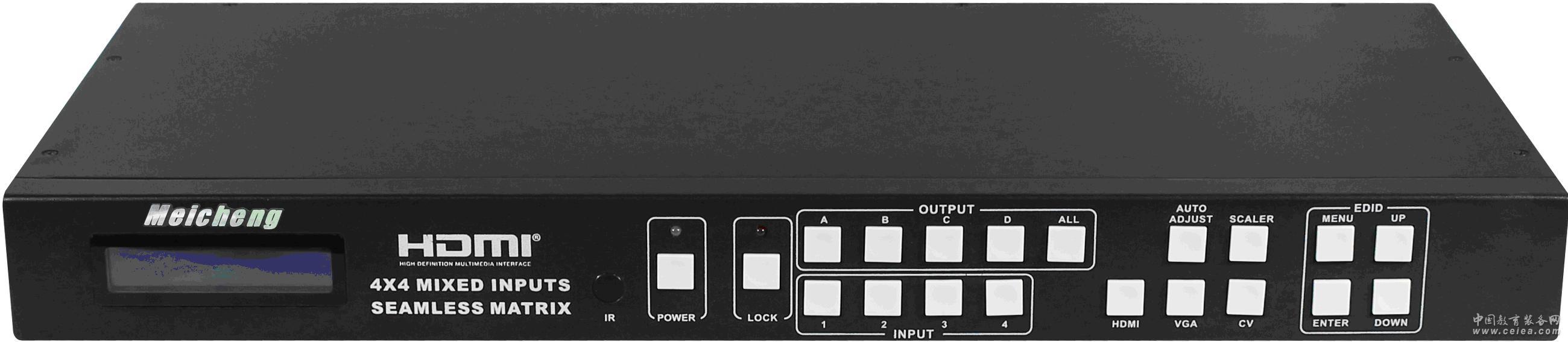 產品詳細介紹MX-1004VW是一款高性能電視墻拼接處理器—具畫面分割、無縫切換輸出及混合輸入4x4矩陣切換器,具4組混合訊號輸入[支持數字和模擬影像訊號],同時4組輸出具無縫切換功能,無縫切換輸出模式分有:快速切換、淡入淡出、拉幕等16種特效。 該混合矩陣切換器采用先進數字處理技術,具影像Scaler(影像處理與轉換)后傳送到顯示器或是電視機的功能,實現并達到了多種格式訊號統一輸出、無縫切換的完美視覺效果。同時紅外線遙控矩陣功能、模擬影像訊號輸入兼具音訊嵌入功能�?刂品绞蕉鄻屿`活,可透過前面板按鈕控制、IR控制、RS-232控制、TCP/IP控制。