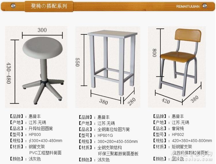 2、HP800 升降繪圖凳 規(guī)格(∮×H): ∮300×430-480mm 采用PVC工程塑料淺灰色凳座面,凳面厚6mm;采用鋼管支架,管身鋼材厚度為1mm烤漆處理;底坐為五錐腳,平穩(wěn)牢固,高度為43-48cm,適合制圖教室常用凳子之一。