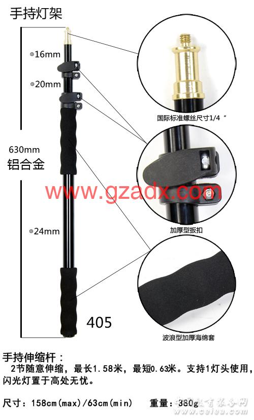 產品詳細介紹廣州市艾狄遜影視器材有限公司成立于2002年,是一家集開發、生產、銷售一體的企業。 公司專業生產相機攝影包、照相機三腳架,及影樓設備等產品。公司現在擁有生產,辦公廠房四千平方米,以質量為生命,誠信為本是我們追求的永恒目標。公司一直以來主要以出口加工、OEM生產為主,產品遠銷世界二十多個國家地區。 易拍寶系列三腳架及攝影包,是我公司經過一年多的國外銷售與客戶不斷地進行改良而投入市場的產品。產品的穩定可靠性得到同行的一致認可。 瞻望未來,艾狄遜公司全體員工將再接再勵,力圖創新,致力于為攝影人士打造更優質、性價比更高的攝影用品。 維特利手持燈架405是一款鋁合金支架,采用扳扣式鎖緊系統,快捷展開和收起,展開長度1.58米,收起長度63cm,燈頭頭部是1/4英寸螺牙,擴展性非常強,可連接相機、云臺、閃光燈、GoPro等,另外底部設計為3/8英寸螺孔,底部可連接支撐三腳架,非常好用; 另外這支手持燈架能下水、抗酷熱耐寒,再惡劣的天氣也能正常使用,是商業攝影師的必備拍攝支架哦,尤其是外拍,比傳統燈架三腳架更便攜更實用。 另外我廠還有多款型號選擇,如加大號展開1.8米、2.9米等,承接貼牌代工OEM,個性化定制等。