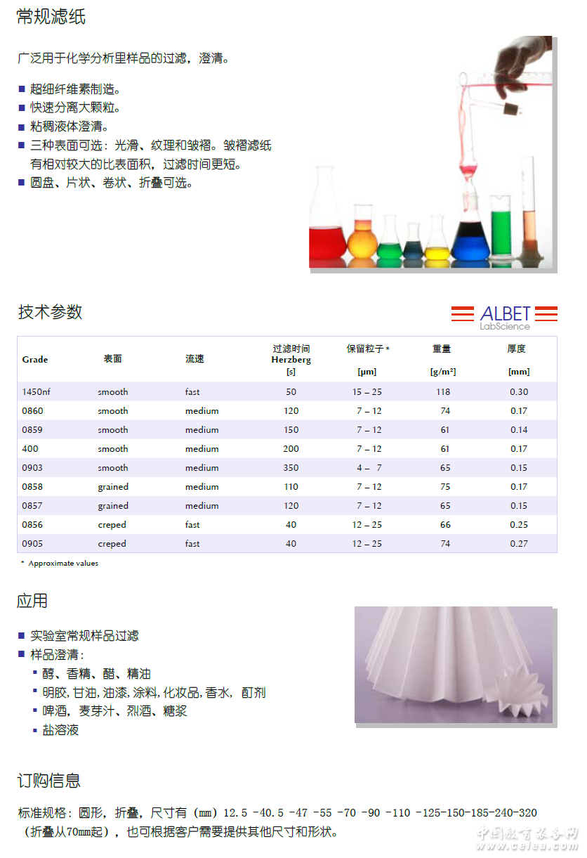 常規(guī)濾紙,廣泛用于化學(xué)分析里樣品的過濾,澄清。 超細(xì)纖維素制造。 快速分離大顆粒。 粘稠液體澄清。 三種表面可選:光滑、紋理和皺褶。皺褶濾紙 有相對(duì)較大的比表面積,過濾時(shí)間更短。 圓盤、片狀、卷狀、折疊可選。 |