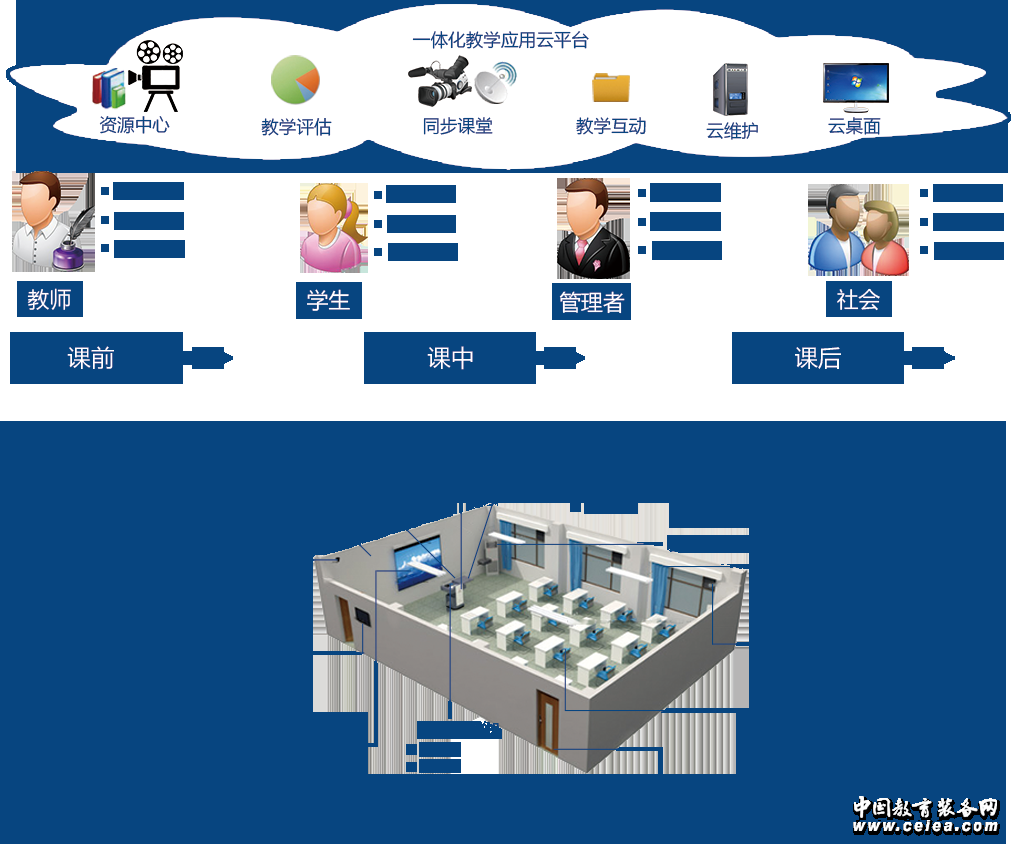 廣凌智慧教室之教室管理系統又分為智能教學設備管理和智能教學環境管理;智能教學設備管理可對教室內的電腦、投影機、投影幕、音響功放、攝像頭、話筒等教輔設備進行集中控制,同時支持移動APP控制,任何移動設備均可輕松控制教學設備;對教室及設備狀態遠程監看和管理、智能投影儀使用狀況分析、智能投影儀使用狀況分析、到課率、在堂率自動統計等。