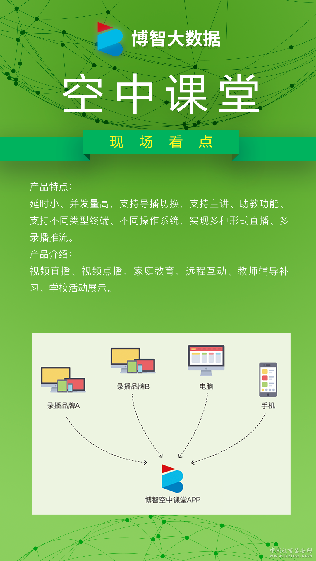 產(chǎn)品詳細介紹博智空中課堂通過rtmp標(biāo)準(zhǔn)協(xié)議,實現(xiàn)多錄播推流,支持視頻資源目錄自定義、客戶端支持局域網(wǎng)大規(guī)模直播無延遲、支持8錄視頻通過軟件導(dǎo)播切換,支持主講、助教功能。可以通過手機、電腦、攝像頭直播推流、實現(xiàn)多種形式直播。 產(chǎn)品特點: 延時小、并發(fā)量高,支持導(dǎo)播切換,支持主講、助教功能、支持不同類型終端、不同操作系統(tǒng),實現(xiàn)多種形式直播、多錄播推流。