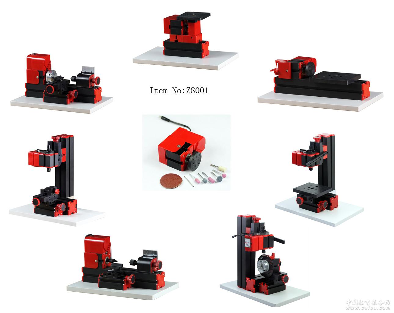 產品詳細介紹八合一套裝可以組裝8種不同功能的機床(線鋸床,木車床,金屬車床,銑床,鉆床,砂磨機,手持機床,分度鉆床),一次只能使用其中一種功能的機床。 1、馬達轉速:20000轉/分鐘(可選12000轉/分鐘)。 2、輸入電壓/電流/功率:12VDC/2A/24W,開關電源的轉入電壓110V—240V。 3、鋸床工作臺面積:90mm x 90mm 4、木車床加工材料最大直徑:50mm,金屬車床可擴大到100mm。 5、金屬車床及木車床加工材料長度:135mm。 6、滑塊行程:X軸145、Y軸30、Z軸30 7、夾頭:1-6mm 8、鉆床工作臺面積:123X100mm 9、虎鉗的最大夾持尺寸:30mm 10、三爪夾盤可夾持工件的最大直徑為50mm 11、分度盤上有三組圓周等份分布的小孔,分別是36、40、48個小孔.可以根據實際需要選擇分度孔的組別。 特點:除銑床(小孩使用銑床一定要在家長或老師的指示下使用)外其它機床具有安全不傷手設置,線鋸加工最大的切鋸深度硬木為 4mm、三夾板為7mm、軟木為18mm、薄鋁片為0.5mm、有機玻璃為2mm,是家庭及學校小孩制作航模及其它木工模型的好工具。 |