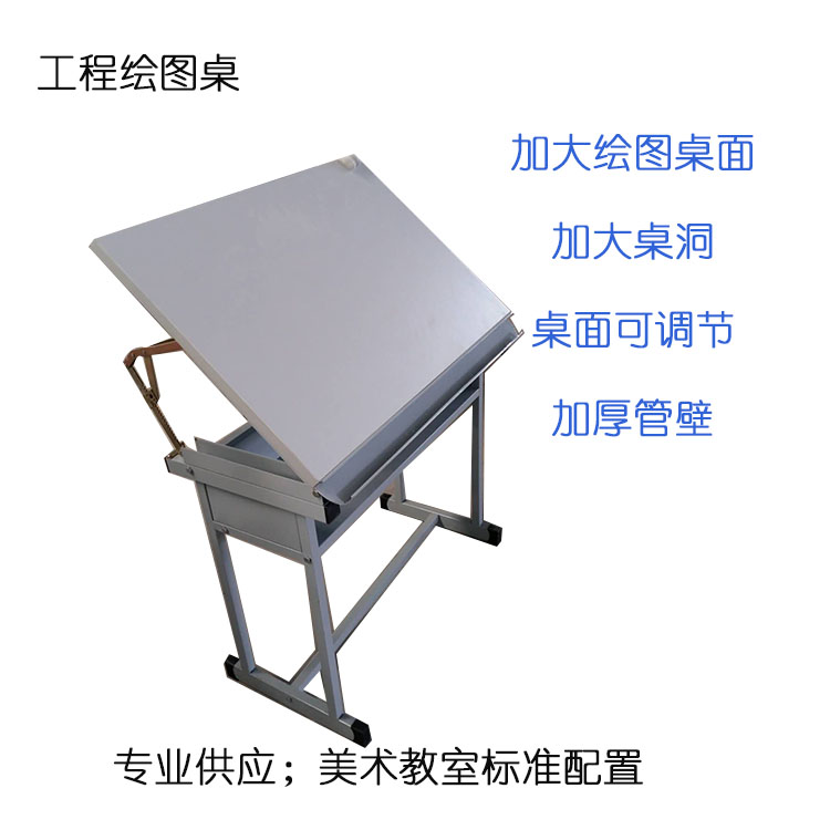 產品詳細介紹源頭廠家,支持來圖定制,參數定制,效果圖方案設計咨詢電話:18663283135 單人美術桌 規格:500*800*780mm材質:翻轉桌面采用16mm環保三聚氰胺飾面板,優質PVC封邊,防水耐磨,帶鋼制擋條筆槽,后帶角度調節支撐桿。桌架采用20*40方管制作,壁厚1.2mm,桌兜高150mm壁厚08mm鋼板制作,桌腿采用40*40nn方管制作,鋼制部分經酸洗磷化靜電噴塑制作而成。桌腳帶有黑色或者藍色防滑注塑腳墊。功能:桌面可以傾斜。 |