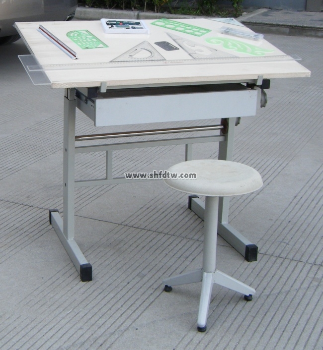 主要特點 1)此款繪圖桌是國內最新型的產品,和國內任何一款繪圖桌的區別在于,采用單邊雙支撐結構,大大增強桌子的穩定性和牢固性。 2)工業桌面采用新型手輪旋鈕進行無級調節傾角,傾角范圍0°-85°,同時具有鎖定裝置,確保傾斜角度不滑動。 3)桌面高度采用符合人體工學原理的適宜高度:780mm,腳柱采用50x25x700方鋼,著地橫管采用 50X30X530mm方鋼,圖板架框由20x20mm方鋼焊接。 4)調節扇形采用2.5mm鐵片沖壓成形,腳套PVC材料,抽屜采用刨花板熱壓防火板,加三級導軌。 |