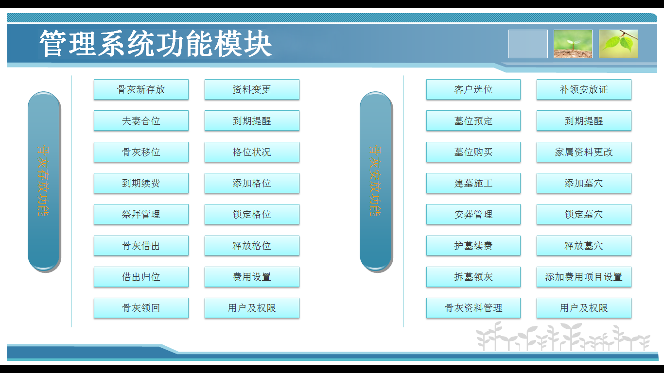 產品詳細介紹慈愿智能存放架管理系統系統由三部分組成,即電腦端的業務管理系統、手機端的家屬服務系統及智能開箱系統。軟件系統中寄存格位的設計通過利用可視化的圖形顯示,并按照實際排列順序進行編號。可對骨灰寄存進行登記、寄存架管理、寄存收費、寄存欠費、到期提醒、骨灰祭奠、骨灰帶出、骨灰返還、骨灰續存、骨灰合并、寄存變更等業務進行辦理。家屬可通過手機掃描二級碼自動開箱,可遠程祭拜和親情留言。 軟件 使用優點:便捷移動端操作,可連接微信端口,實行移動端直接實現陵園實景介紹、移動端進行業務管理、提供線上咨詢及導航等便捷功能。從而使得陵園管理更規范化、標準化、自動化、流程化。 系統功能: 寄存登記:針對需要寄存的業務進行詳細登記、選定寄存格位。打印寄存證、寄存卡功能。根據寄存時間自動產生寄存費用 寄存變更:打印新的寄存證、寄存卡;寄存撤消、續存登記、資料變更;骨灰取走:詳細記錄取走時間、委辦人等,釋放補占用的寄存格 到期提醒:管理費到期提醒、拜祭提醒、超度法會提醒,對客戶進行人性化提醒。 統計報表:統計某段時間的不同物品銷售明細,便于財務進行月底的對賬管理可以統計出某筆業務的單筆銷售明細。支持導出明細至EXCEL。 寄存位狀況查詢:以位圖的形勢反應出寄存格位的情況。不同的顏色區分當前格位的狀態�?梢圆榭串斍案裎坏募拇鏄I務資料。 基礎設置:對系統數據字典進行維護,如:戶籍、死因、民族、國籍等生成數據字典,方便使用時調取。可維護系統用戶,可對不同用戶進行分組,使不同的組別成員擁有不同的權限。 自動開箱:用戶可通過指紋、密碼開箱,系統后臺對用戶手機認證綁定后,用戶通過掃描二維碼按確認即可開箱。 一卡通:在使用射頻識別門禁系統,門禁卡IC注冊為箱門的鑰匙卡,每一用戶的箱門可以設置的卡數無上限,方便家屬隨時開箱。