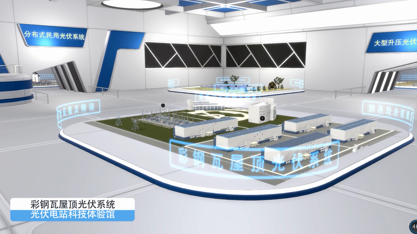 1)典型光伏電站虛擬仿真體驗館包含漁光互補電站、農光互補電站、分布式戶用并網和離網光伏電站,典型并網大型帶升壓變壓器地面光伏電站、兆瓦級別大型電站和光伏電站中控室。