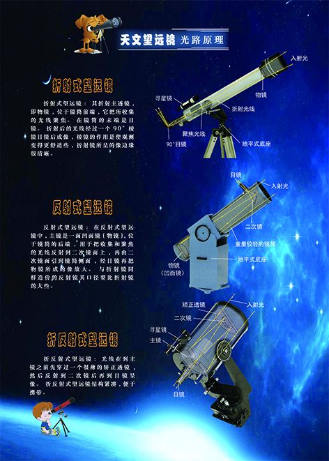 三種天文望遠鏡光路,用發(fā)光二極管流水點亮,直觀通路,對使用天文望遠鏡及制作天文望遠鏡能有科學的了解。材料亞克力噴繪,光路流水。