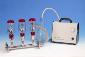 多聯(lián)過濾系統(tǒng)的組成: 系統(tǒng)過濾器支架,可換膜過濾器組件,過度瓶(收集瓶),真空泵組成。 支架采用316L不銹鋼材質(zhì),換膜過濾器采用特硬料玻璃除氫氟酸、熱磷酸外,對一般的酸具有耐腐蝕性是一款性價比很高的多聯(lián)過濾器。