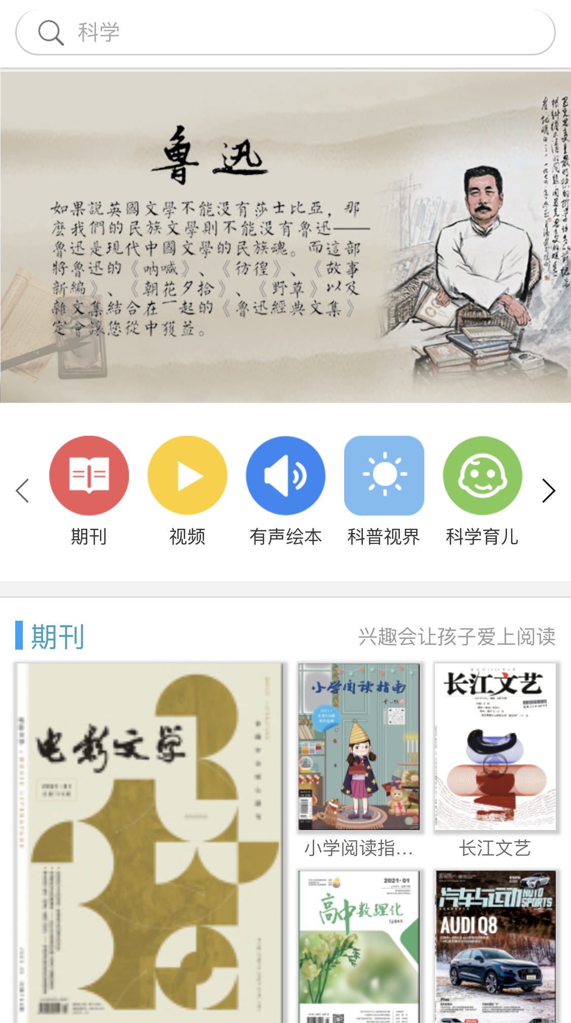 我們的微信移動端包含的產品主要有:科普視界、少兒數字圖書館、學前教育知識庫、中小學數字圖書館。