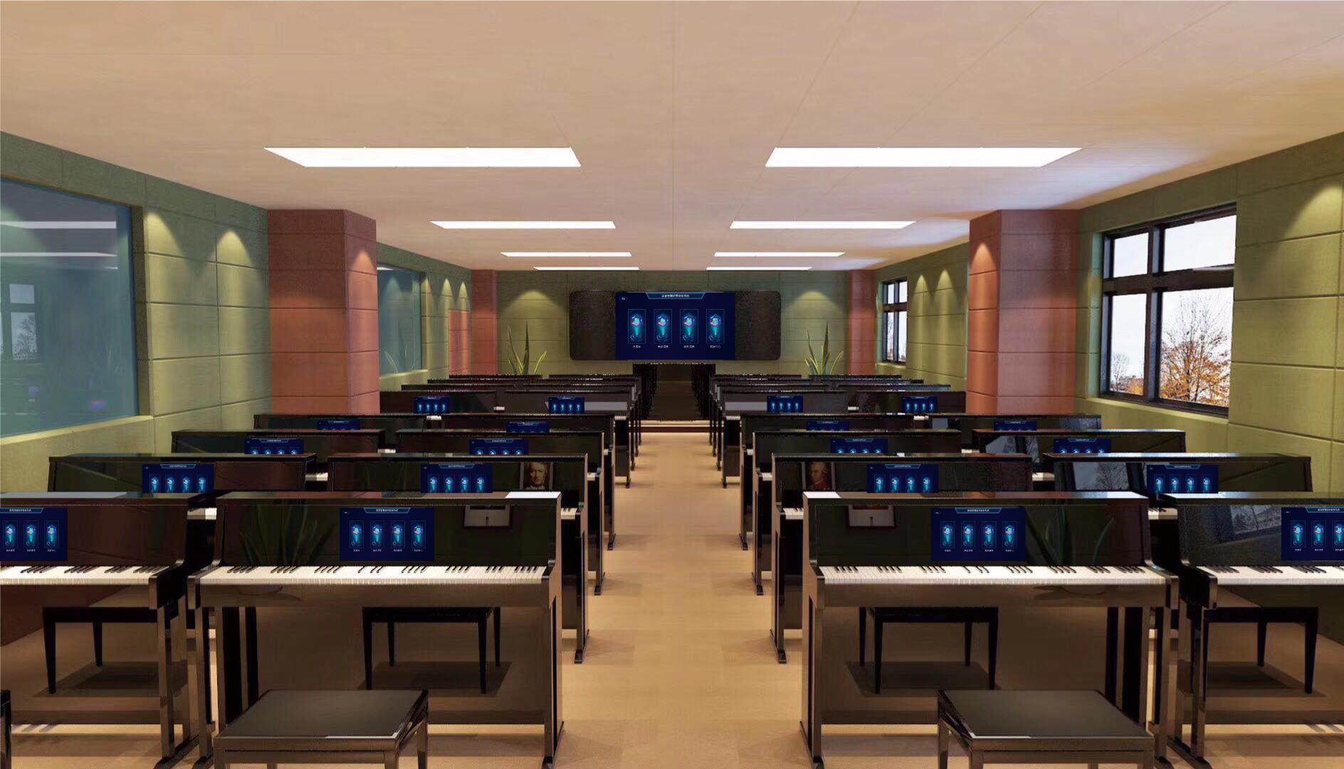★五線譜: 五線譜模塊是智慧鋼琴教學系統的主要學習模塊,該模塊通過師生同步授課和學生自行練習進行功能展示。師生同步授課時,教師控制課件,編輯五線譜,為學生下發任務,查看學生練琴分數,并通過控制臺連接學生音頻、視頻,實現實時監聽學生得彈奏情況,連接視頻可實時查看學生得手型指法是否正確。學生自主練琴時自己選擇彈奏模式,拆分五線譜,進行練習。 五線譜模塊主要功能有: AB段:點擊進入AB段選擇狀態后,以小節為單位,選取起始小節組成一段,該段單獨顯示進行彈奏; 左右手:默認顯示雙手彈奏樂譜,點擊切換單手,右手狀態時左手低音譜號五線譜部分遮蓋,彈奏時不記分,反之右手遮蓋,不記分;左右手和AB段可互相關聯,可在選擇了AB段后的基礎上選擇左右手; 調速:五線譜按原曲速度彈奏,可加減速度,速度分三個檔位:原速、低速、高速,點擊加減按鈕可調節速度檔位;調速功能和節拍器關聯; 節拍器:打開可開啟節拍器聲音,輔助彈奏練習; 播放:點擊可按原速播放該五線譜,播放時紅線跟隨節奏自動滾動,播放過后的部分有顏色提示; 演奏:點擊演奏按鈕后,3秒倒計時后指示線按照樂譜原速度自動滾動播放,播放時需按照音高和節奏要求進行彈奏。音高和節奏均彈奏正確時該音符記分,音高正確節奏錯誤時該音符記一半分數。彈奏結束后計算該樂譜彈奏得分; 練習:每彈奏一次鋼琴琴鍵,指示線向后滾動一次,沒有節奏時值計算,只判斷音高是否正確。彈奏正確有正確顏色渲染提示,彈奏錯誤有錯誤顏色渲染提示。彈奏結束時記分; 試奏:只有鋼琴鍵盤彈奏正確時指示線才向下一組音符滾動,彈奏錯誤時指示線不會滾動,試奏彈奏模式不記分; 任務:教師選擇彈奏模式和拆分五線譜之后,點擊任務,選擇任務遍數,將選擇的五線譜下發給學生進行彈奏,學生收到任務后進行彈奏,彈奏結束后顯示該次任務的分數,任務分數記錄在成績報告中。任務彈奏時,教師可實時查看學生彈奏的分數; 控制臺:教師在上課時的五線譜課件中,選擇控制臺,展示該班級所有已在上課狀態時的學生,在音頻模塊,教師可選擇連接一個學生,監聽該學生的彈奏音頻。在視頻模塊,教師可選擇最多四位學生的視頻影像進行投放,將學生的彈奏手型投放到大屏幕上。