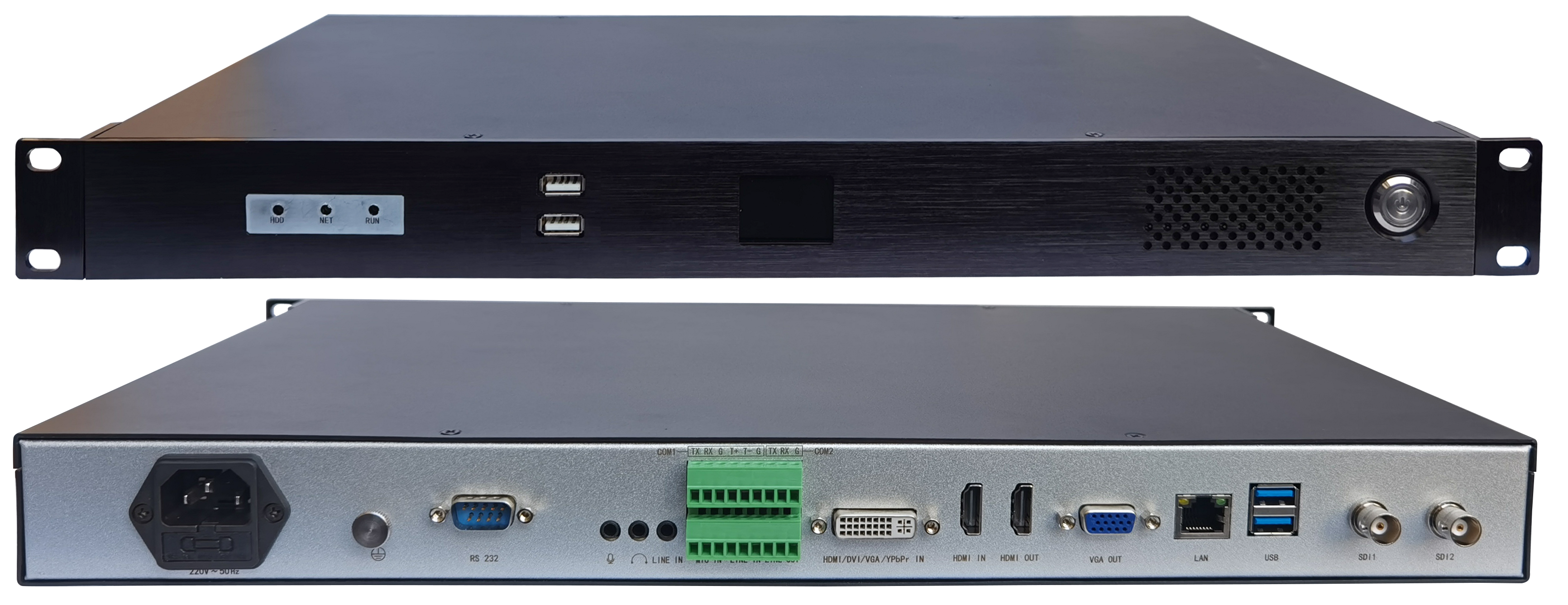 二、 主要特性 1. 集支持4K合成編碼、4KHDMI輸入、4K合成HDMI輸出、RTSP/H.323/SIP多協(xié)議四方互動(dòng)、音頻處理為一體。 2. 主機(jī)內(nèi)置錄制、直播、點(diǎn)播、導(dǎo)播管理、存儲(chǔ)、無(wú)縫切換等功能集成在一臺(tái)主機(jī)內(nèi)。 3. 主機(jī)1U架構(gòu),前面板內(nèi)嵌液晶監(jiān)視器,采用嵌入式DSP純硬件架構(gòu);Linux操作系統(tǒng);能夠7*24小時(shí)工作; 4. 視頻輸入接口:4路物理接口。分別為高清攝像機(jī)3G/HD-SDI輸入2路、1路HDMI輸入接口、1路DVI-I(HDMI/VGA/DVI),4路網(wǎng)絡(luò)源。方便接入網(wǎng)絡(luò)攝像機(jī)或者與第三方系統(tǒng)對(duì)接; 5. 視頻輸出接口:2路高清輸出端子可輸出2路不同畫面,端子分別為1路HDMI輸出,最高支持4K輸出; 1路VGA 1080P輸出; 6. 音頻接口:1路麥克風(fēng)接入自帶幻象電源;1路立體聲線路接入;1路線路輸出、1路3.5mm本地耳機(jī)監(jiān)聽(tīng)接口,1路3.5mm麥克風(fēng)輸入,1路3.5mm立體聲輸入。 7. 控制接口:4路RS232/RS485串口、4路USB接口,其中1路支持USB3.0。 8. 網(wǎng)絡(luò)接口:1路RJ45 LAN接口。 9. 編碼:1路4K編碼;或7路1080p30fps音視頻編碼;獨(dú)立4路音頻采集。 10. 解碼:4路1080p30fps音視頻解碼; 11. 編碼格式:視頻支持H.264SVC/HP/MP/BP可選;音頻音頻編碼格式AAC/G.711。媒體文件格式MP4。視頻編碼碼流:56Kbps~16Mbps可調(diào),音頻采樣率8-48HZ可調(diào),音頻編碼碼率8-320Kbps可調(diào)。 12. 畫面合成:1路畫面合成,提供2/4/6/8/自定義等多種模式選擇,合成分辨率4K或1080P設(shè)置。 13. 可選配音頻處理器模塊:支持混音編組、自動(dòng)反饋抑制AFC、自動(dòng)回聲消除AEC、自動(dòng)噪聲消除ANC; 14. 遠(yuǎn)程互動(dòng):支持RTSP/H.323/SIP等多協(xié)議混合遠(yuǎn)程應(yīng)用模式,RTSP/SIP支持四方互動(dòng)模式; 15. 流媒體協(xié)議:支持TCP/UDP/RTSP/RTP/RTMP/ONVIF/H.323/SIP/TS協(xié)議 16. 存儲(chǔ):標(biāo)配1T硬盤,最大可支持1路SATA接口硬盤,支持單盤6T硬盤,可實(shí)現(xiàn)7路碼流實(shí)時(shí)存儲(chǔ)能力,在設(shè)備網(wǎng)頁(yè)及設(shè)備輸出導(dǎo)播界面中具備對(duì)單個(gè)視頻文件查看、下載、與刪除等功能。 |