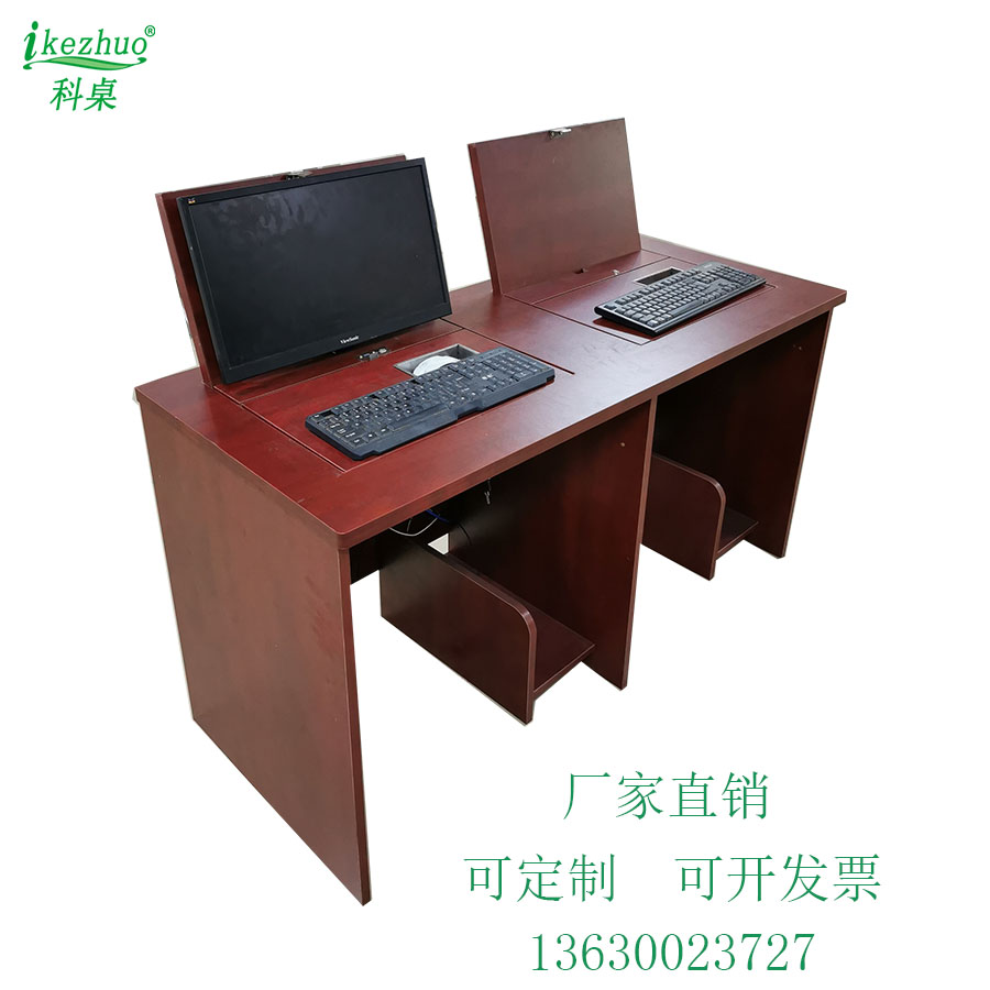 產品詳細介紹科桌翻轉電腦桌主要應用于各種大型會議室,學術報告廳,計算機教室,多媒體教室、多媒體會議室、多媒體電子教室、多媒體電教室、機房、培訓中心,展廳內及多功能會議廳等。普通教室與計算機教室模式相互切換快速,不阻礙老師與學生之間目光交流當需要使用顯示器時輕按前端桌面板隱藏在桌子內部的顯示器會自動從桌子下面升到桌面翻轉到合適角度。 當不使用顯示器時,可手動按下顯示器翻蓋面板至桌面平整,顯示器自動鎖住隱藏在桌子內與桌面保持平整一致。起到防塵,防盜,保持桌面平整美觀。使用方便,手動控制,翻轉自如。