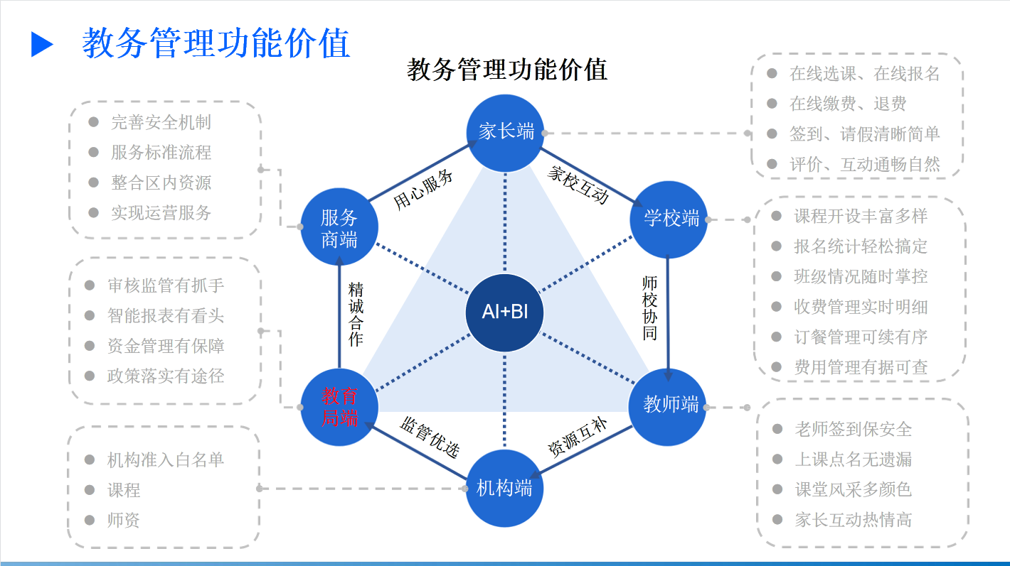 做法:向教育局提案合作解決方案,或與學校單獨合作。搭建區域獨立應用的校園課后服務、社團管理信息化管理系統,整合當地培訓機構,形成資源課程庫、協助學校成立課后管委會,審核機構課程與老師、提供優質課程,協助學校排課選課工作,為學校排課選課、午餐管理、家校溝通、教務管理,評價體系、信息互通、財務管理等整體解決。對課前、課中、課后、安全、衛生管理,期末成果展示等形成考核機制。為政府、學校文化建設、家長服務。建立可持續發展體系。