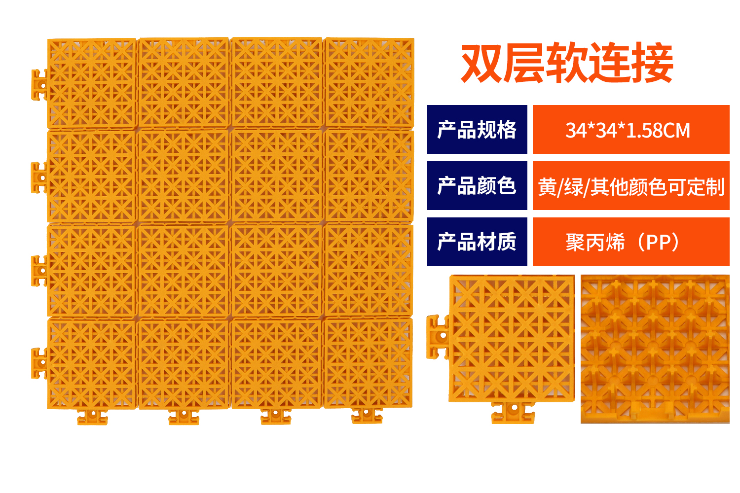 34 (長) ×34 (寬) ×1.58cm (高) 雙層軟連接 單片重量 340g±5 克 2 、材料: 采用食品級全新聚丙烯(PP)高強度改性材料和進口助劑生產,保證產品環保性和耐侯性 3 、連接方式: 新型方形彈簧式伸縮扣,有效緩解熱脹冷縮(專利設計) 4 、自帶隱藏式連接地面螺絲孔: 防止場地地板走位移動及地板受氣溫影響引起的拉伸和收縮,能使產品定位 于地面,并不影響美觀及無任何安全隱患 5 、面層結構: 啞光防眩光表面,強光下不刺眼、不反光,防止地板在日照情況下出現眩光情況; 磨砂曬紋表面,增強地板表層耐磨與防滑度,保證雙重緩沖作用,提升運動安全舒適性, 雙層米字棱形鏤空面層,雙層結構使產品的物理性能加強,在長時間的戶外鋪裝中,雙層地板的 場地變形基數遠低于單面層地板。 6 、底部結構: 底部多個加粗加密式十字形懸浮支撐柱,提供垂直緩沖效果, 導水槽結構,實現快速排水,防止場地大面積積水。