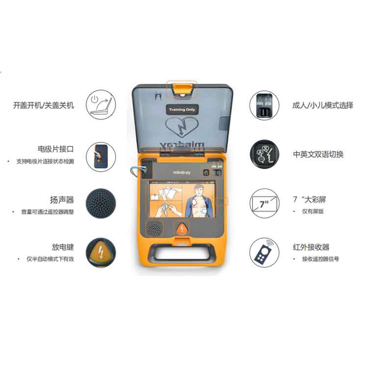 訓(xùn)練機(jī)作為AED急救的培訓(xùn)器具,邁瑞AED自動(dòng)體外除顫儀訓(xùn)練機(jī),和真機(jī)AED外形尺寸,操作使用一樣,具有:智能易用,可靠耐用,7寸大屏,動(dòng)畫(huà)提示,聲音提示,教學(xué)培訓(xùn)方便等特性。