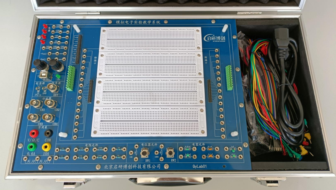 產(chǎn)品詳細(xì)介紹(一)實(shí)驗(yàn)教學(xué)系統(tǒng)主要特點(diǎn): 1.實(shí)驗(yàn)教學(xué)系統(tǒng)必須采用主實(shí)驗(yàn)箱+模塊化的結(jié)構(gòu)組合方式設(shè)計(jì);配有實(shí)驗(yàn)板安裝接口底座,實(shí)驗(yàn)板更換簡(jiǎn)便;實(shí)驗(yàn)電路原理圖布局在PCB板頂層,方便測(cè)量和觀察設(shè)計(jì),多模塊集成,支持模擬電子電路系統(tǒng)設(shè)計(jì)與性能驗(yàn)證,學(xué)生不用插各種芯片和進(jìn)行復(fù)雜連線,提升實(shí)驗(yàn)效率; 2.實(shí)驗(yàn)教學(xué)系統(tǒng)必須便攜式結(jié)構(gòu)、移動(dòng)靈活,箱體尺寸小于55×35×15cm,重量低于5kg;不受實(shí)訓(xùn)室場(chǎng)地限制,方便開(kāi)展隨堂實(shí)驗(yàn)、技能培訓(xùn)、電子競(jìng)賽等多種活動(dòng); 3.實(shí)驗(yàn)教學(xué)系統(tǒng)實(shí)驗(yàn)板的每個(gè)實(shí)驗(yàn)?zāi)K單元均由電路原理圖和電路實(shí)物兩部分組成,二者對(duì)應(yīng),便于電路直觀識(shí)圖,理論與實(shí)踐結(jié)合; 4.各個(gè)模塊均配有電源(帶LED指示)接線端口、地接線端口,輸入、輸出、地接線柱及各功能測(cè)點(diǎn)接線柱,方便連線操作和接入測(cè)試探頭; 5.提供教學(xué)樣例實(shí)驗(yàn)程序及軟件免費(fèi)升級(jí)服務(wù),并做好培訓(xùn)工作,培訓(xùn)時(shí)間不少于2天,免費(fèi)質(zhì)保期叁年。 (二)實(shí)驗(yàn)教學(xué)系統(tǒng)底板技術(shù)指標(biāo); 1.提供4個(gè)示波器通道;配有標(biāo)準(zhǔn)的BNC接口,帶寬100MHz,實(shí)時(shí)采樣率1GSa/s; 2.提供1個(gè)波形發(fā)生器:配有標(biāo)準(zhǔn)的BNC接口,信號(hào)輸出頻率范圍:DC 1Hz~25MHz,波形幅度:±3.5Vmax; 3.提供萬(wàn)用表:配有標(biāo)準(zhǔn)的接口,直流電壓量程800V,電流測(cè)量量程10A,二極管測(cè)量范圍2V; 4.提供波形校準(zhǔn)源; 5.上述所提供的各儀器均可與PC機(jī)連接; 6.提供面包板:面包板尺寸170*138mm; 7.直流電源:電源輸出:+5V、-5V、+12V、-12V; 8.可調(diào)直流電源:0~12V,0~-12V; 9.實(shí)驗(yàn)系統(tǒng)電源帶有保護(hù)功能。 (三)實(shí)驗(yàn)內(nèi)容: 1.共發(fā)射極放大電路; 2.共集電極放大電路; 3.共基極放大電路; 4.多級(jí)放大及反饋電路; 5.差動(dòng)放大電路; 6.場(chǎng)效應(yīng)管放大電路; 7.同相比例放大電路; 8.反相比例放大電路; 9.反相比例加法電路; 10.積分電路; 11.微分電路; 12.集成運(yùn)放兩級(jí)放大電路; 13.二階低通有源濾波電路; 14.二階高通有源濾波電路; 15.過(guò)零比較器電路; 16.遲滯比較器電路; 17.窗口比較器電路; 18.方波三角波發(fā)生器電路; 19.二極管限幅電路; 20.二極管穩(wěn)壓電路; 21.半波整流濾波電路; 22.全波整流濾波電路; 23.集成功率放大電路; 24.RC正弦振蕩電路; 25.LC振蕩電路; 26.串聯(lián)晶體管穩(wěn)壓電路; 27.三端集成穩(wěn)壓電源實(shí)驗(yàn)。 |