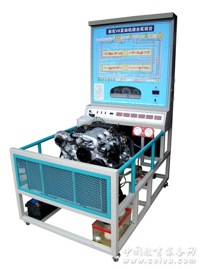 產品組成:別克V6發動機和控制單元,儀表總成,冷卻液溫度傳感器、進氣溫度傳感器、節氣門控制總成、空氣質量計、氧傳感器、中央控制電器盒、點火開關、整套散熱機構,汽油箱和汽油泵總成等等,臺架面板繪有電噴發動機完整的彩色電路原理圖和電腦一一對應的外接式檢測端子.