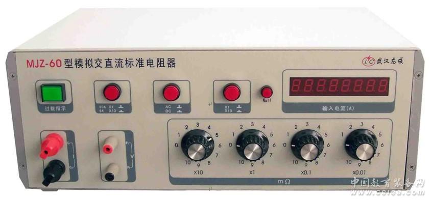 產品詳細介紹MJZ-60型模擬交直流標準電阻器 (接地導通電阻測試儀檢定裝置) 一、性能特點 1 采用精密電子線路,使得儀器具有噪音低、靈敏度高、量限寬等特點。 2 一次額定電流:60A、6A。 3 電阻四盤連續帶電可調。 4 直接指示一次電流值,可做交直流大電流標準表用。