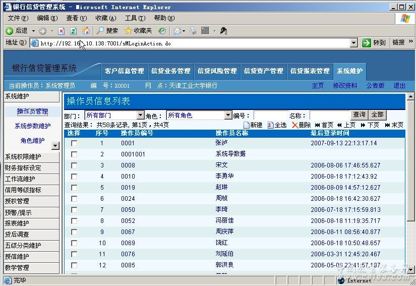 該系統以總行為數據中心的集中式數據網絡系統方式,把信貸日常業務處理、決策管理流程、貸款和客戶資料積累、貸款風險預警、貸款分類評級、數據統計分析、信貸監督檢查等信貸管理的各個環節和過程全部納入計算機處理,形成覆蓋信貸管理全過程的科學體系,實現網絡互聯、信息共享、查詢自如、方便快捷的信貸電子化管理系統;也就是把信貸管理過程形成的所有資料用計算機存儲和記錄,通過現代信息網絡技術,形成一個完善的信貸電子化管理系統,將信貸規章制度和具體要求轉化為電腦程序進行控制,創造“制度制約+機器制約”,實現“以客戶為中心、以優質客戶發現為前提、以時常和行業為導向、以風險控制為核心、以量化分析為主”的新的信貸管理機制。系統采用銀行信貸管理系統流行的B/S結構,在操作的過程中系統提供了許多的提示,使用戶可以清楚的了解到操作中碰到的問題。系統提供了工作臺、公告板等功能使用戶方便的了解到需要進行的操作。