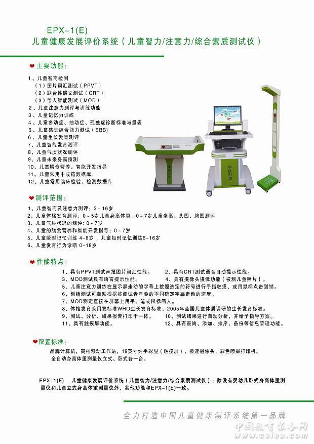 一、技術參數: 1、技術規格 1.1主機CPU頻率2.6G以上 1.2 硬盤500G以上,內存2GB以上 1.3 19寸液晶顯示器(具有觸摸屏功能) 1.4 該系統必須配置同品牌,能夠連接同品牌測評系統,臥室、立式測量儀測量模式通過測評系統實現自動轉換。 1.5采用距陣測量法的超聲波嬰幼兒身長體重計及兒童身高體重計,能自動測量兒童的身高和體重,測量結果直接由數碼管顯示和語音報數,相關數據直接傳輸至工作站進行分析。隨時存儲、并打印測量結果。 1.6 嬰幼兒身長測量范圍:30~100cm 測量精度:±0.5cm 嬰幼兒體重測量范圍:0~100kg 測量精度:±20g 兒童身高測量范圍:60~170cm 測量精度:±0.5cm 兒童體重測量范圍:0~180kg 測量精度:±20g 2、儀器功能 2.1主要功能 2.1.1兒童智商(IQ)測評功能:圖片詞匯測試、聯合性瑞文測試(CRT-3)、繪人智能測試、 2.1.2兒童注意力測評與訓練功能,具有4種方法; 2.1.3兒童感覺統合能力測評(SBB)功能,具有2種方法。 2.1.4兒童生長發育測評(體格、智能、氣質)功能,具有2種方法。 2.1.5兒童膳食營養、智能開發指導。 2.1.6兒童記憶訓練:兒童瞬時記憶訓練和兒童短時記憶訓練。 2.1.7兒童未來身高預測 2.1.8 DDST篩查功能 2.1.9兒童多動癥診斷標準與量表,具有4種方法 2.1.10抽動癥診斷標準與量表,具有2種方法 2.1.11孤獨癥診斷標準與量表,具有4種方法。 2.2測評范圍: 2.2.1兒童智商及注意力測評:3~16歲 2.2.2兒童體格發育測評:0~5歲兒童身高體重 2.2.3兒童綜合智能發展測評:0~3歲半 2.2.4丹佛發展篩選量表(DDST) 0~6半 2.2.5兒童氣質狀況的測評: 0~7歲分0~1歲、1~3歲、3~7歲三個年齡段。 2.2.6兒童的膳食營養和智能開發指導:0~7歲 2.2.7兒童瞬時記憶訓練 4-8歲 ,兒童短時記憶訓練6-16歲 2.2.8兒童發育行為診斷 0-18歲 2.3性能特點: 2.3.1具有PPVT測試聲報圖片詞匯性能。 2.3.2具有CRT測試語音自動提示性能,MOD測試具有語言提示性能。 2.3.3 MOD測試具有語言提示性能 2.3.4兒童注意力訓練在顯示屏走動的字幕上按照選定的符號進行手指觸摸、或用鼠標點擊劃銷。 2.3.5劃銷測試可自動根據被測試者年齡的不同確定字幕走動的速度。 2.3.6 MOD測定直接在屏幕上用手、筆或鼠標畫人。 2.3.7體格發育采用WHO生長發育標準. 2.4 配備音響為內置一體音響 2.5測試、分析、結果報告打印于一體。 2.6具有觸摸屏功能。 2.7具有攝像頭攝像功能(被測兒童照片)。 2.8四種界面模式自由切換。 2.9兩種模式自動導出測量數據文本。 2.10兩種數據備份模式自由切換。 2.11兩種測試結果表達模式自由切換。 2.12兩種生長發育測評標準自由切換。 2.13兩種標準模式自由切換。 2.14具有查詢、添加、排序、備份等信息管理功能 2.15提供劃銷測驗、瑞文測驗和感覺綜合測試軟件 3、儀器配置 3.1主機一臺(推車式、含鍵盤、鼠標) 3.2顯示器:19寸液晶顯示器(觸摸屏) 3.3計算機主機一臺:品牌電腦 3.4彩色噴墨打印機:1臺 3.5極速攝像頭1個:≥100萬像素 3.6臥式身長體重自動測量計:1臺 3.7立式身高體重自動測量計:1臺 3.8說明書:1本 3.9保修卡:2張 二、主要用途及材質:該系統包含兒童智力測試、兒童注意力測試及兒童綜合素質測試三部分,利用劃銷測試,瑞文試驗和感覺綜合測試對兒童發展、發育狀況進行綜合評價。 |