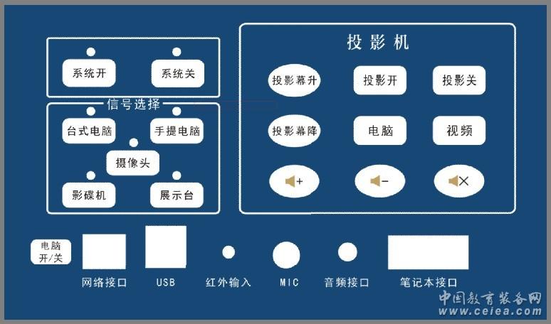 產品詳細介紹★1、多媒體一體中控主要特點:4×2VGA切換,3*3視頻矩陣;有單獨電腦開關按鍵;前控制面板帶網絡接口、2路USB接口、話筒接口、筆記本電腦音頻、筆記本VGA口;,可擴展為網絡中控; ★2、視頻矩陣:內置4×2VGA切換分配器,分辨率可測能達到1920*1080,帶400MHZ長線驅動器,支持臺式電腦、手提電腦、數字展臺、數字DVD輸入; 3、音頻矩陣:內置3路音頻輸入,1路輸出; ★4、視頻矩陣:內置3路視頻輸入,3路輸出 5、控制功能:內嵌式紅外學習功能,支持電腦軟件操作、面板操作、全功能紅外遙控器操作; 6、RS-232控制接口:1路可編程RS-232控制接口,可用RS-232控制投影機; 7、音量控制:內置1路高保真無級音量調節(jié); 8、紅外發(fā)射接口:1路紅外發(fā)射接口,可紅外自學習控制投影機; 8、I/O控制接口:2路I/O控制接口,具有投影機防盜功能,并可連接門磁開關、實現連鎖控制; 9、電源保護:自動延時投影機電源保護器,檢測投影機燈泡的工作情況,并且自動延時斷電; ★10、電源管理:強弱電分體設計,系統(tǒng)更安全。二路強電控制管理:一路屏幕升降,一路投影電源;采用專業(yè)電源,輸入12V/2A,性能更穩(wěn)定; ★11、即插即用:內置超過60種投影232碼,簡單撥位設置即可使用。免調試功能多種開機方式和信源自定義,音量自動記憶功能。 ★12、1路MIC輸入,方便用戶講解; 13、中控開孔尺寸:188mm×110mm;中控外觀尺寸:215*125*125mm |