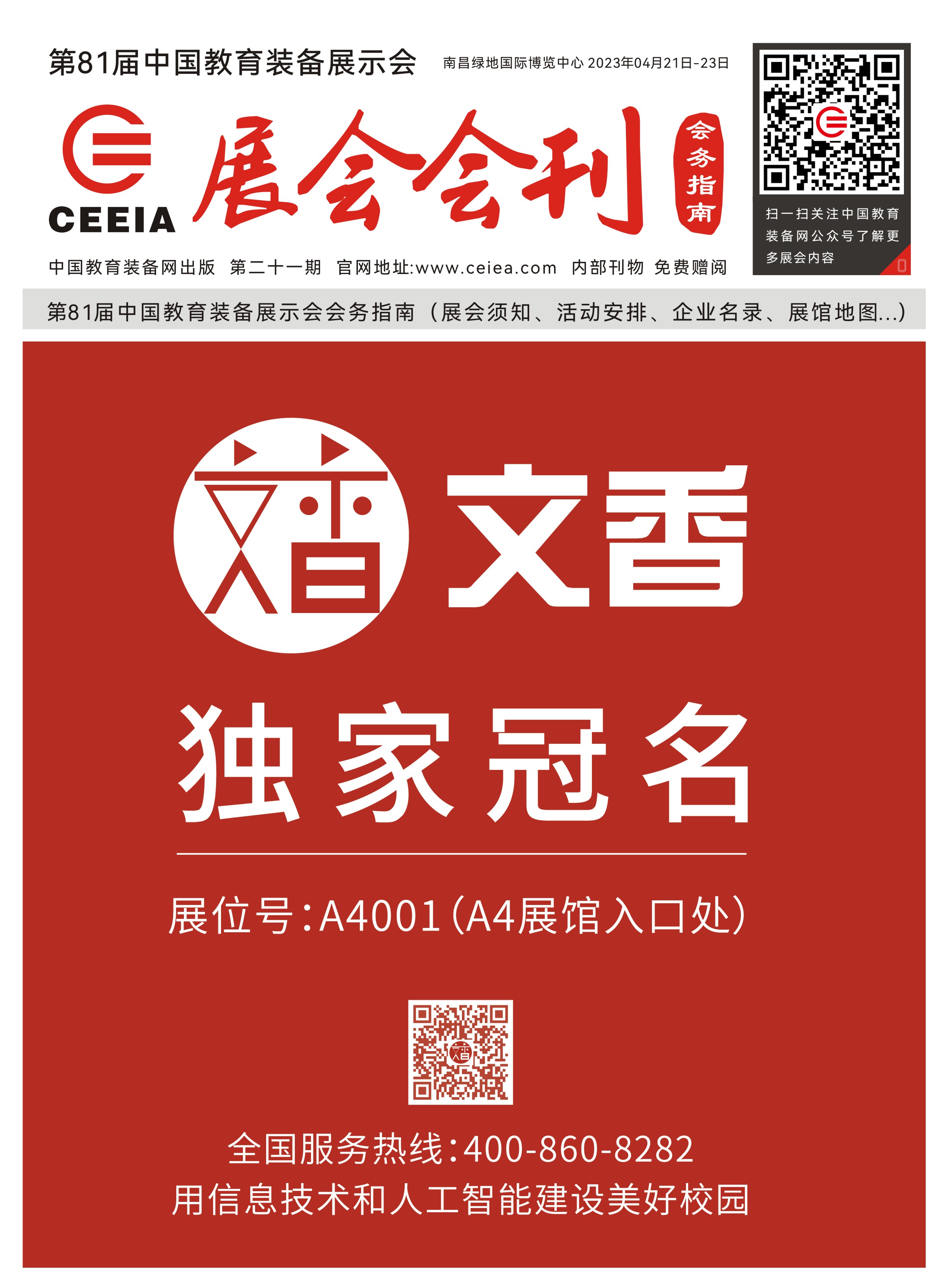 為更好的服務展會、服務企業、服務觀眾,自第80屆中國教育裝備展示會開始,《展會會刊 》《會務指南 》兩刊合一,《第81屆中國教育裝備展示會展會會刊 》展會期間現場發放給各省參會領導、代表、參展企業以及現場觀眾。 會刊內容包含參展企業名錄、日程安排、行業資訊、場館地圖等。會刊既滿足了參展企業的宣傳需求,也滿足了現場群眾的觀展需求�,F正式開放會刊電子版在線免費下載,方便大家閱讀交流!