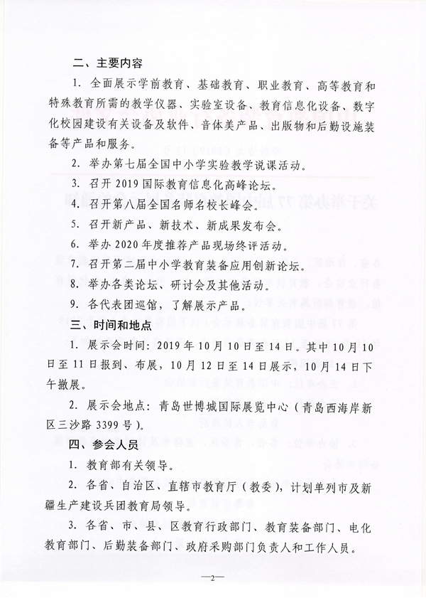 第77屆中國教育裝備展示會(以下簡稱展示會)定于2019年10月10日至14日在青島市舉辦,現將有關事項通知如下: