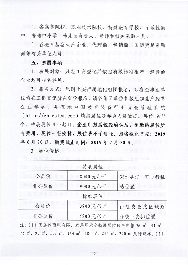 2.報名方式:原則上實行屬地化組團報名,即各企事業單位均在工商登記所在省份報名。請各組團單位積極組織生產經營企業參展,并登錄中國教育裝備行業協會管理系統(http://zh.ceiea.com)填報展位及參會人員數據。展位9m2/個,特展展位4個起訂。企業申報展位經確認后,須繳納展位所有費用,展位一經安排,展位費不予退還。報名截止日期:2019年6月20日,繳費截止時間:2019年7月30日。