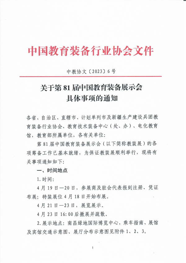 第81屆中國教育裝備展示會(以下簡稱教裝展)的各項籌備工作已基本就緒,為保證教裝展順利舉行,現(xiàn)將有關事項通知如下: