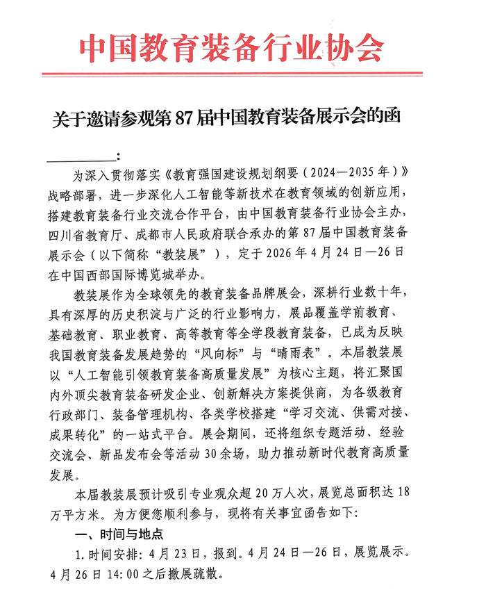 主辦單位:中國教育裝備行業協會展會時間:2026年4月24-26日展會地點:四川成都中國西部國際博覽城