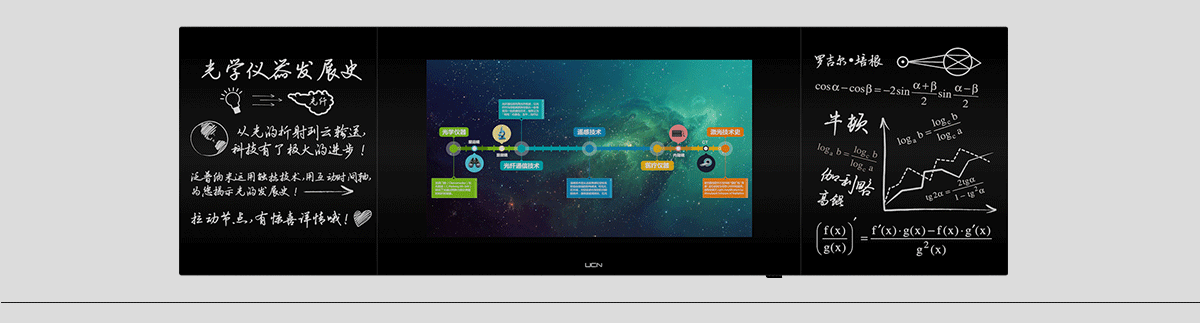 UCN 納米觸控黑板是一款革命性智能互動教學(xué)設(shè)備。它集納米觸控、液晶顯示、電腦主機于一體,搭載i-tech專業(yè)教學(xué)軟件。