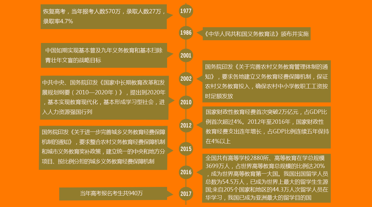 改革開放之初的1978年,我國小學升初中的比例只有60.5%,中等職業教育學生數占高中階段教育的比例不足6%,高等教育毛入學率只有1.55%;2016年,我國的學前教育毛入園率77.4%,小學凈入學率99.9%,初中毛入學率104%,九年義務教育鞏固率93.4%,高中階段毛入學率87.5%,均超中高收入國家平均水平。詳細>>> |